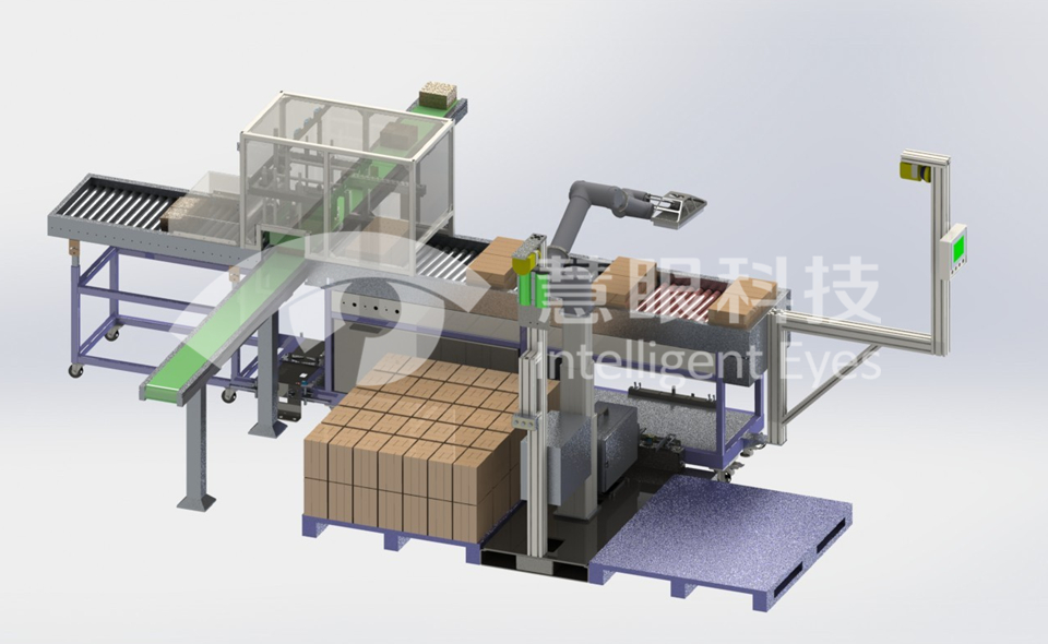 可移动式中包码垛机器人是将中包机生产出来的中包(12支)通过双包输送机构、缓存机构及输送皮带送至指定位置后,通过码垛机器人UR10将中包堆叠在地台板上。为了能成功匹配450pcs/min的生产机速,整套设备需要三台UR10机器人同时进行工作。