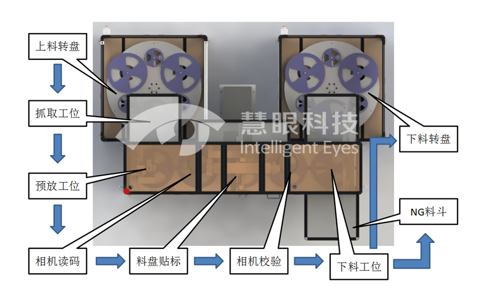 快速上下料,减少拿取料盘的时间 读取料盘条码信息并录入系统 实时打印贴标 对比系统数据,校验一维码是否正确 料盘标签外观检测 生产过程中,同时可以上下料 根据客户需求增加个性化模块(多种标签模板的识别、料盘的分类功能等)